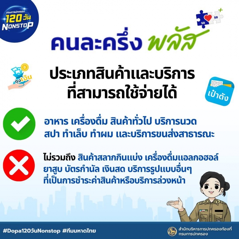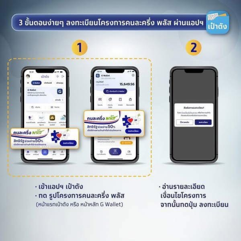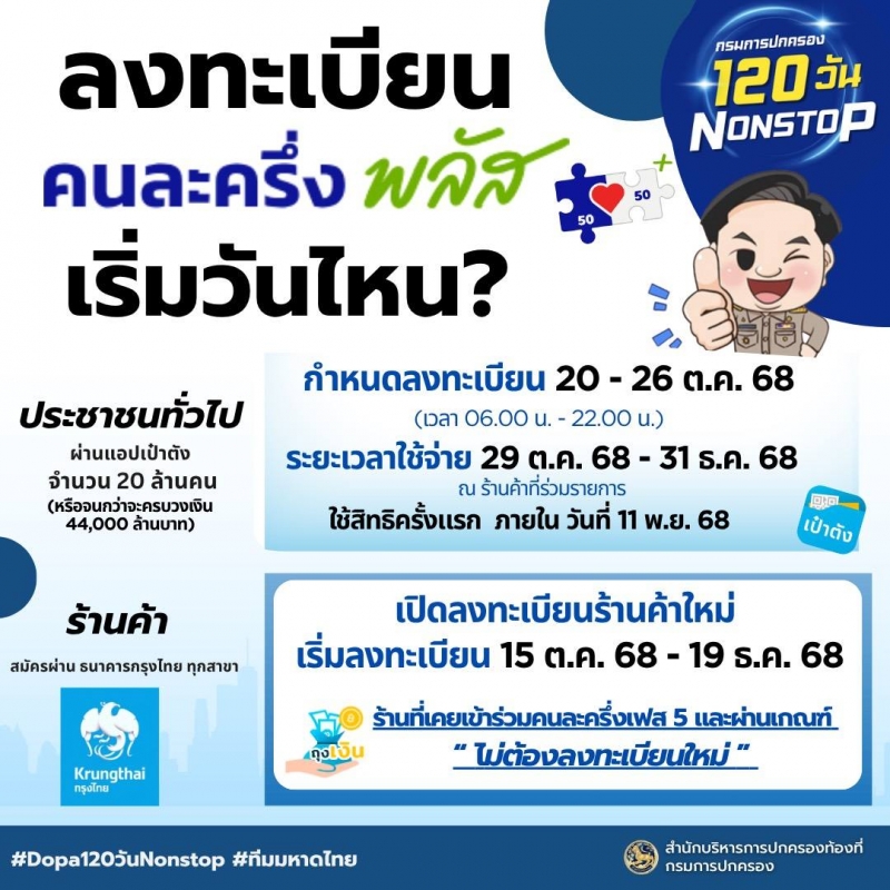 หมายเหตุ : ตรวจสอบรายละเอียด คุณสมบัติ วิธีการลงทะเบียน ข้อสงสัยต่างๆ เพิ่มเติมได้ที่เว็ปไซต์ คนละครึ่งพลัส