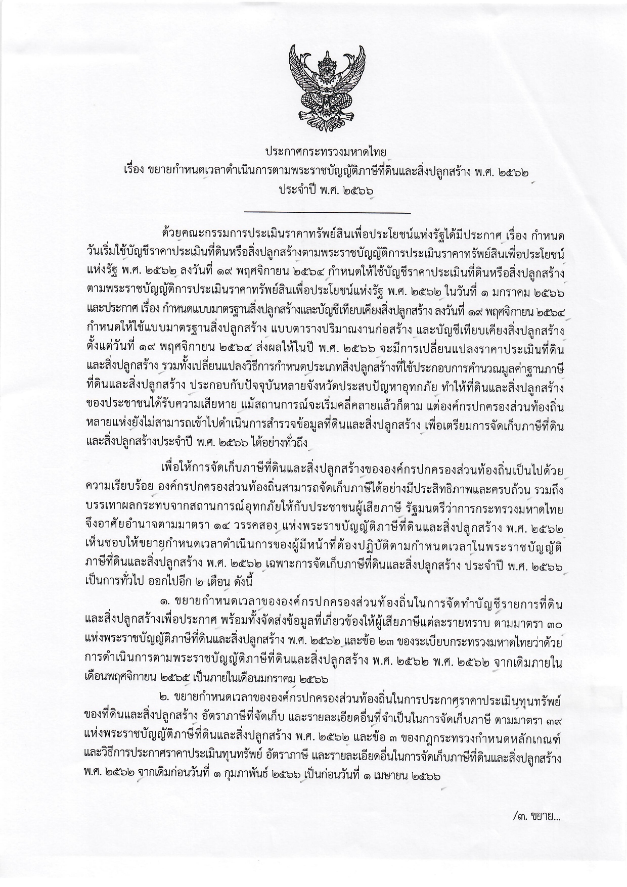 | 85 | ประกาศกระทรวงมหาดไทย เรื่อง ขยายกำหนดเวลาดำเนินการตามพระราชบัญญัติภาษีที่ดินและสิ่งปลูกสร้าง พ.ศ.2562 ประจำปี พ.ศ.2566 |  | 13 ธ.ค. 2565 | 87 |