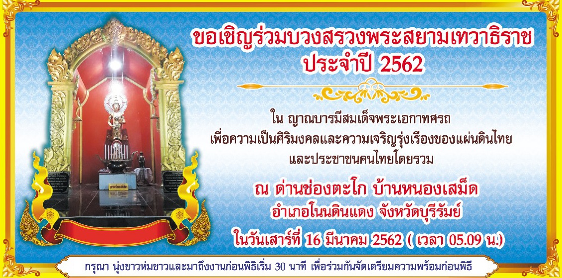 | 294 | ขอเชิญร่วมบวงสรวงพระสยามเทวาธิราช ประจำปี 2562 ณ ด่านช่องตะโก บ้านหนองเสม็ด อ.โนนดินแดง จ.บุรีรัมย์ วันที่ 16 มีนาคม 2562 |  | 15 มี.ค. 2562 | 97 |