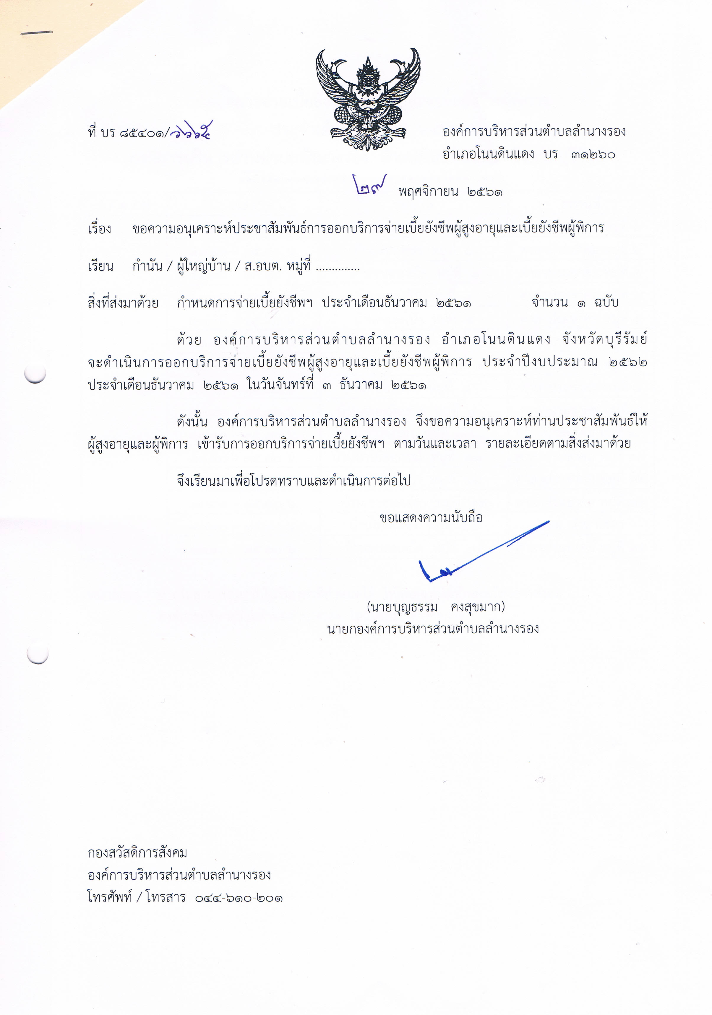 | 326 | ประชาสัมพันธ์การออกจ่ายเบี้ยยังชีพผู้สูงอายุและผู้พิการ ประจำเดือนธันวาคม 2561 |  | 29 พ.ย. 2561 | 82 |
