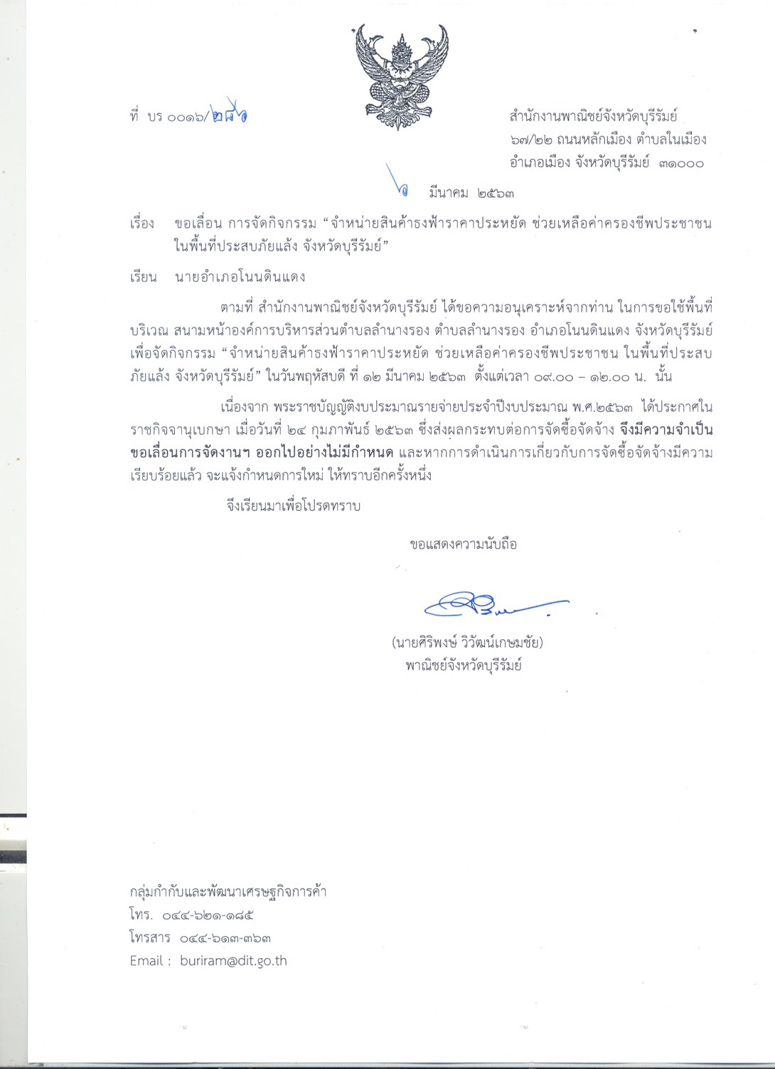 | 240 | ประชาสัมพันธ์ การจำหน่ายสินค้าธงฟ้าราคาประหยัด ช่วยเหลือค่าครองชีพประชาชนในพื้นที่ประสบภัยแล้ง จังหวัดบุรีรัมย์ ณ บริเวณสนามหน้า องค์การบริหารส่วนตำบลลำนางรอง วันที่ 12 มี.ค.2563 |  | 28 ก.พ. 2563 | 114 |