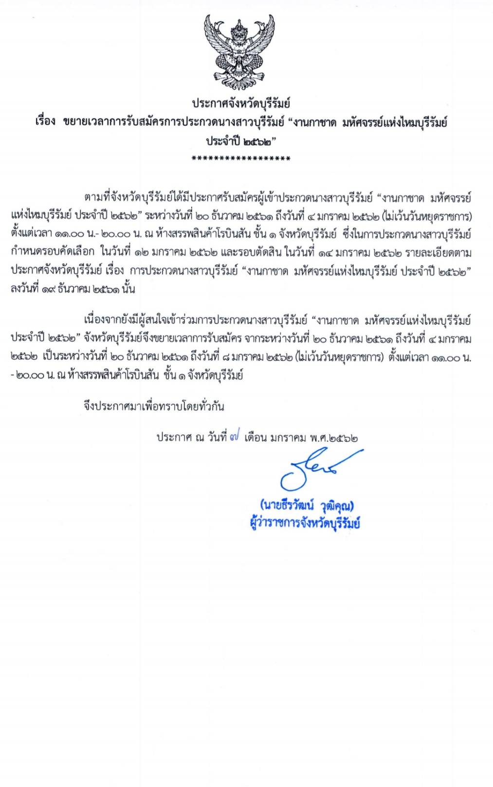 | 310 | ขยายเวลาการรับสมัครการประกวด “นางสาวบุรีรัมย์” งานกาชาดมหัศจรรย์แห่งไหมบุรีรัมย์ ประจำปี 2562 |  | 7 ม.ค. 2562 | 115 |