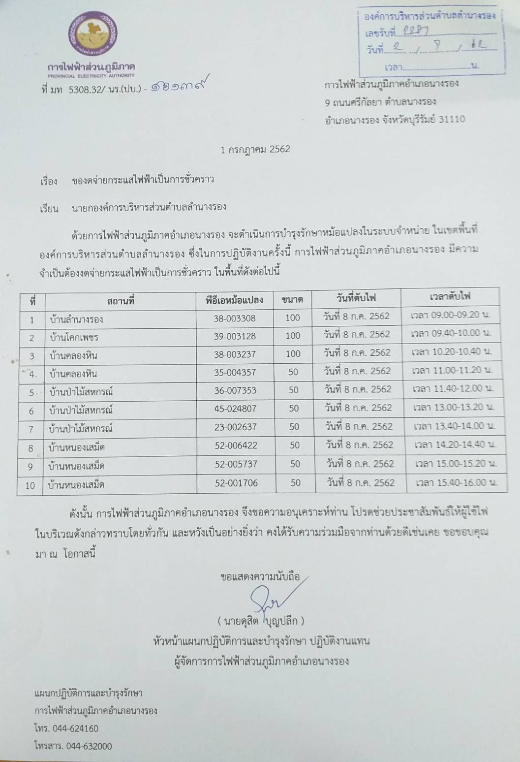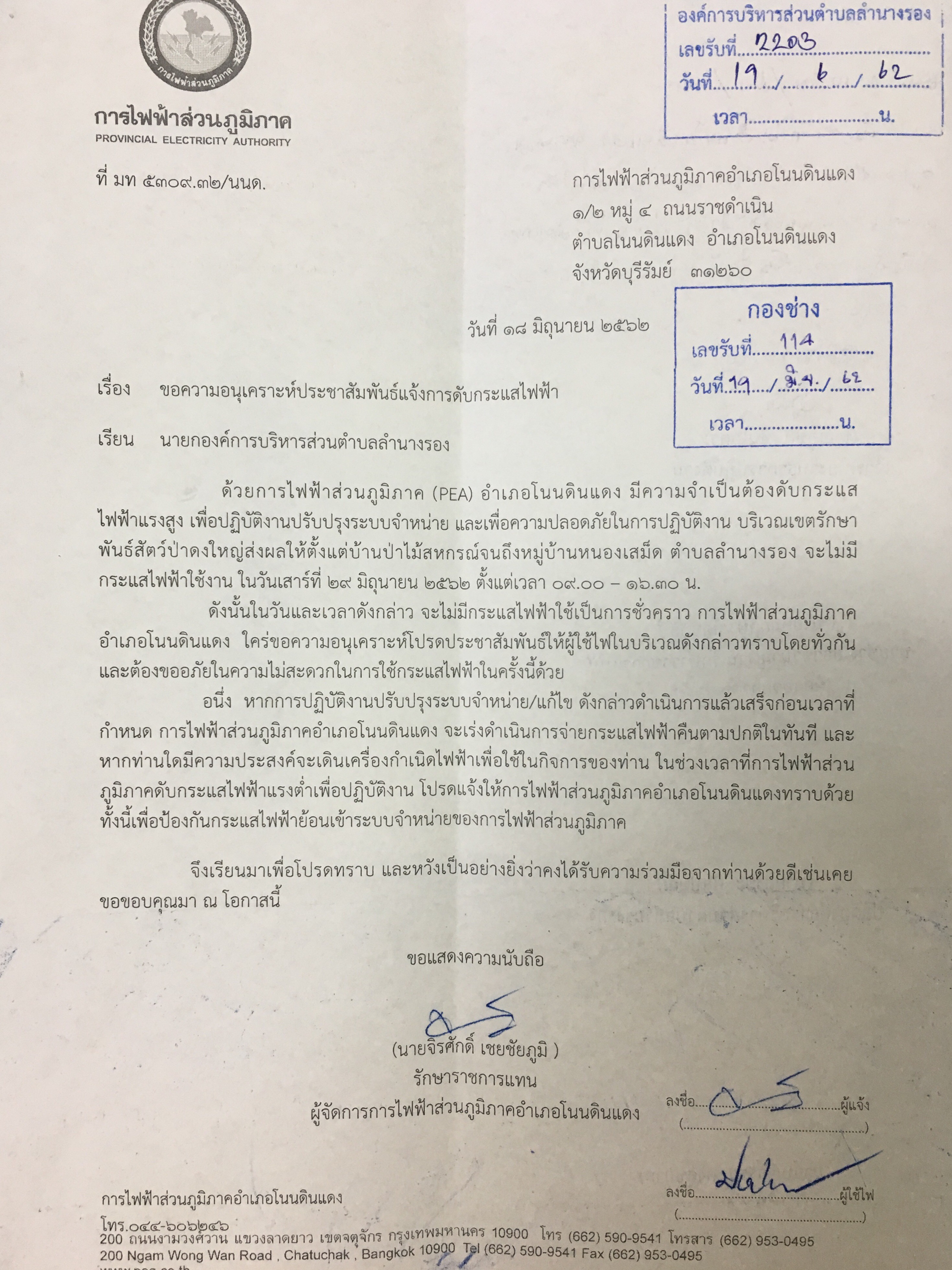 | 277 | การไฟฟ้าฯแจ้งงดจ่ายกระแสไฟฟ้าเป็นการชั่วคราว ในวันที่ 8 กรกฎาคม 2562 (รายละเอียดตามไฟล์เอกสารที่แนบมาด้วย) |  | 5 ก.ค. 2562 | 89 |