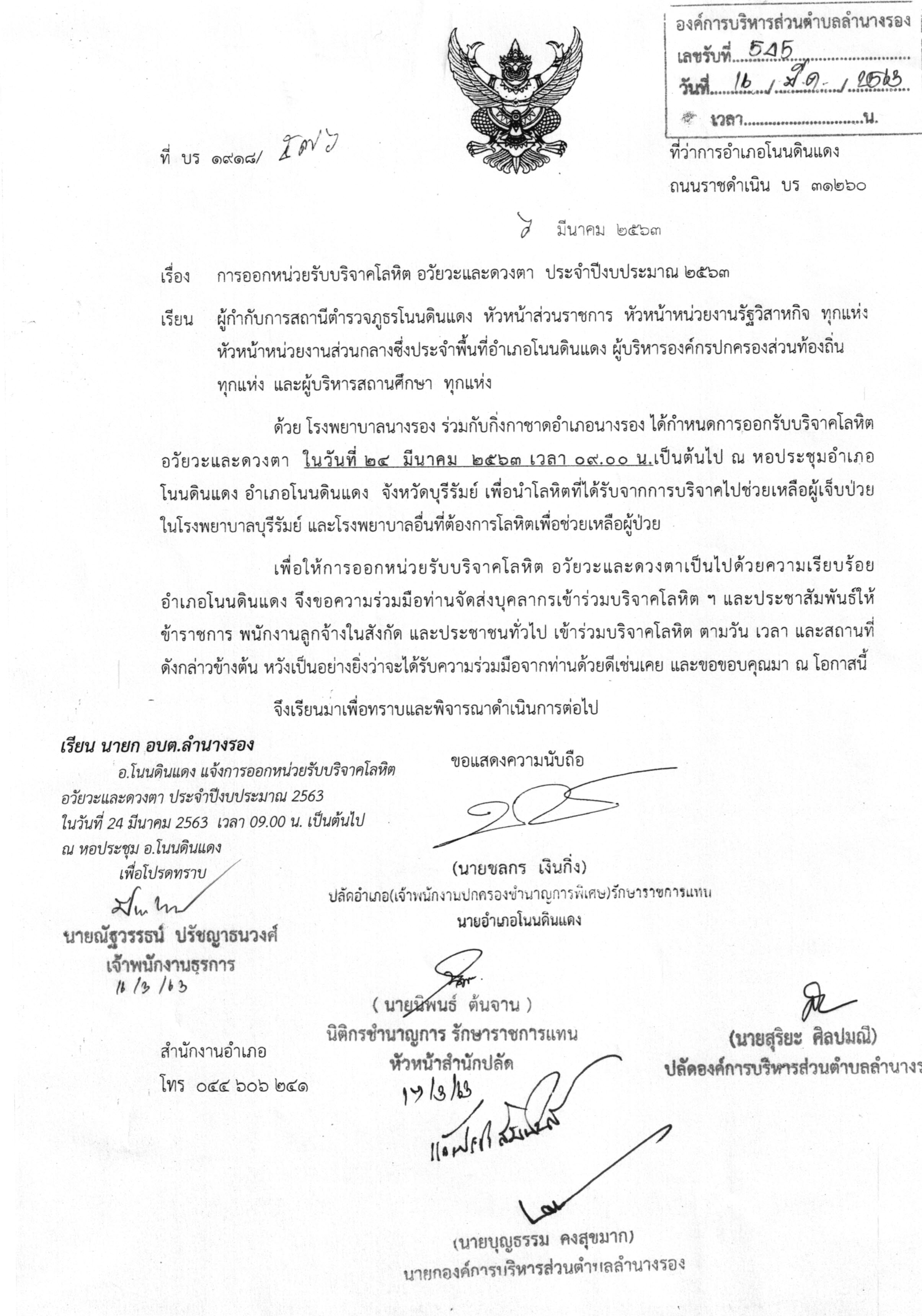 | 238 | ขอเชิญร่วมบริจาคโลหิต ในวันอังคารที่ 24 มีนาคม 2562 เวลา 09.00 น. เป็นต้นไป ณ หอประชุมอำเภอโนนดินแดง อ.โนนดินแดง จ.บุรีรัมย์ |  | 18 มี.ค. 2563 | 105 |