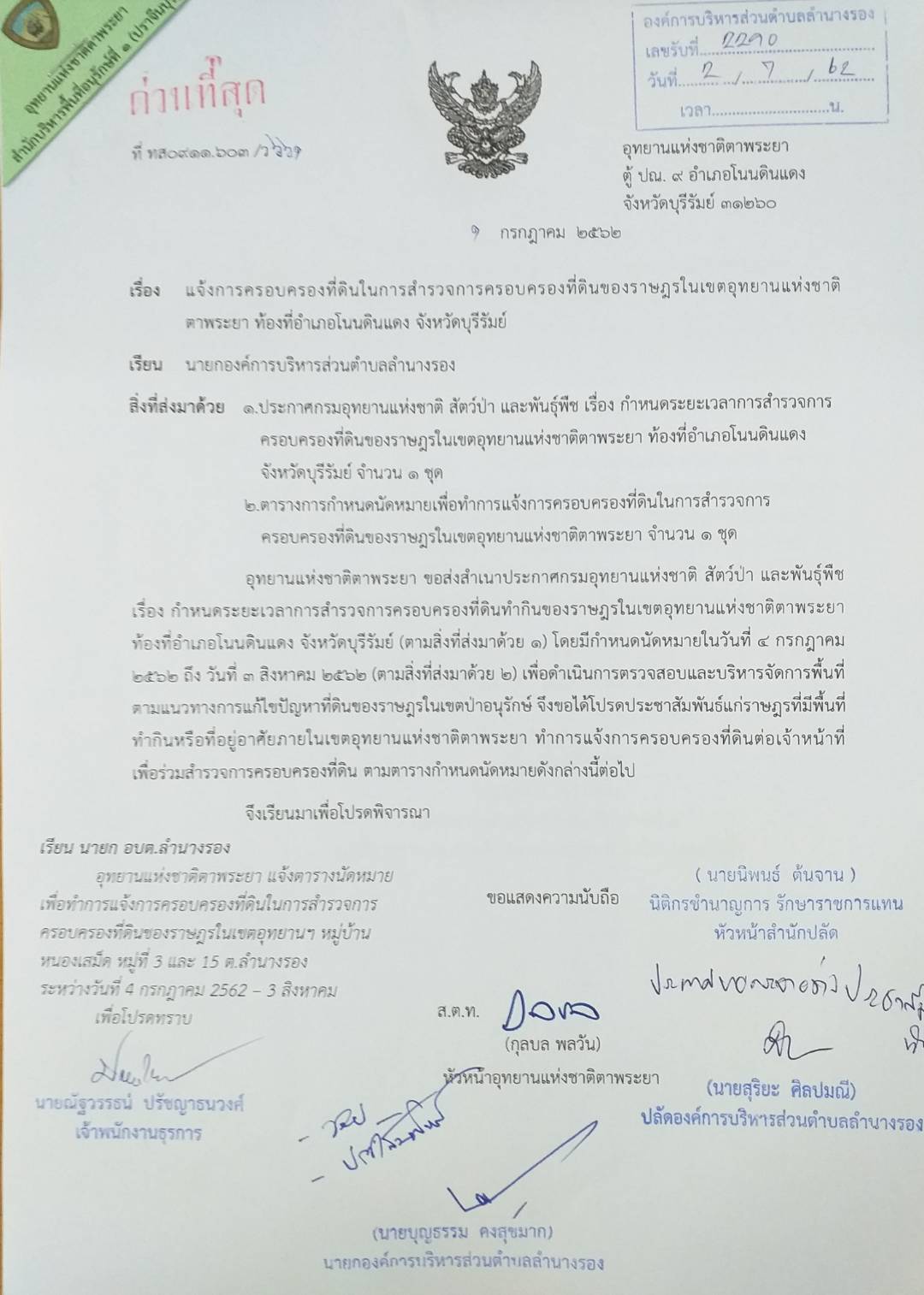 | 278 | อุทยานแห่งชาติตาพระยา แจ้งตารางกำหนดนัดหมายเพื่อทำการแจ้งการครอบครองที่ดินในการสำรวจการครอบครองที่ดินของราษฎรในเขตอุทยานแห่งชาติตาพระยา ระหว่างวันที่ 4 กรกฎาคม 2562 ถึงวันที่ 3 สิงหาคม 2562 |  | 4 ก.ค. 2562 | 82 |