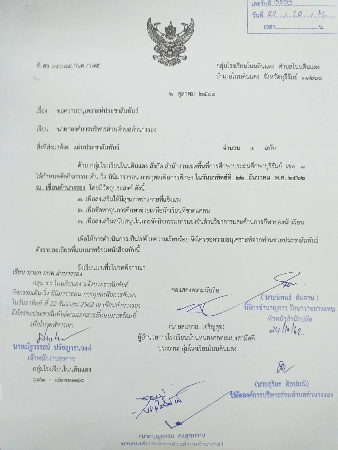 | 264 | ประชาสัมพันธ์กิจกรรมเดิน-วิ่ง มินิมาราธอน การกุศลเพื่อการศึกษา ณ เขื่อนลำนางรอง NondindaengRAOSUMinimarathon2019 |  | 28 ต.ค. 2562 | 108 |