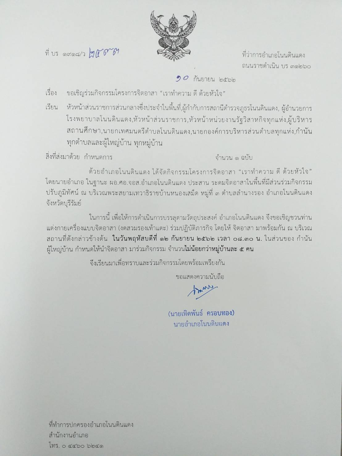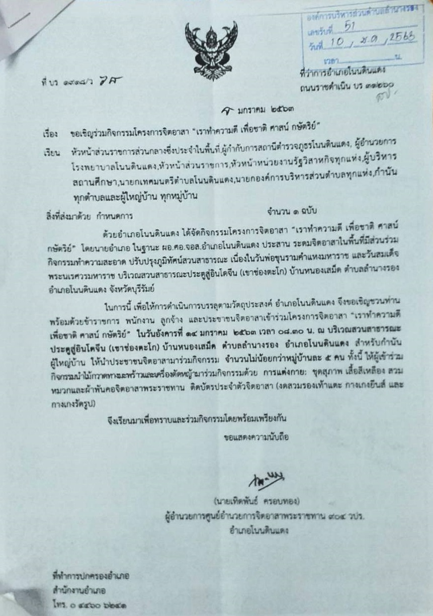 | 254 | ขอเชิญร่วมกิจกรรมโครงการจิตอาสา "เราทำความดี เพื่อชาติ ศาสน์ กษัตริย์" ณ บริเวณสวนสาธารณะประตูสู่อินโดจีน(เขาช่องตะโก) บ้านหนองเสม็ด วันที่ 14-01-2563 |  | 13 ม.ค. 2563 | 169 |