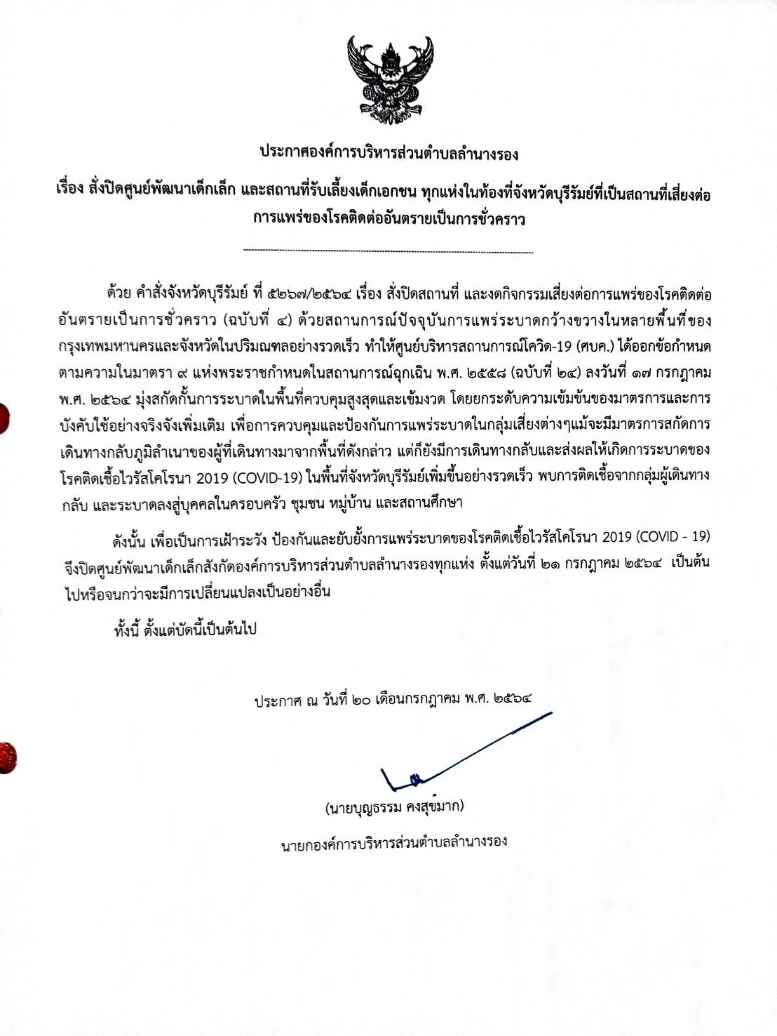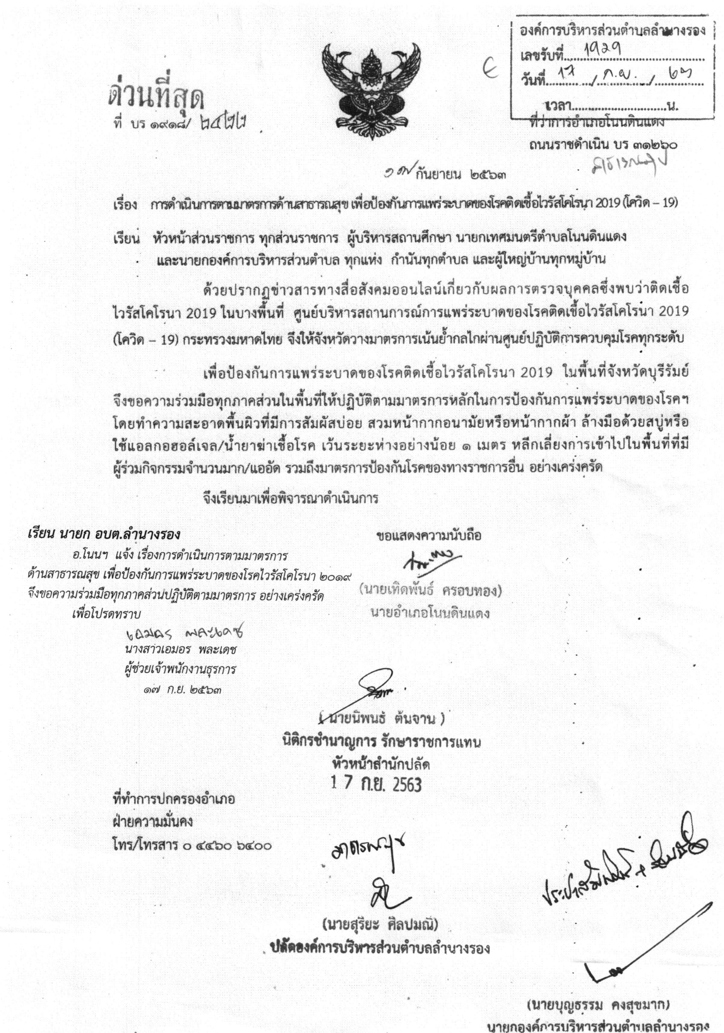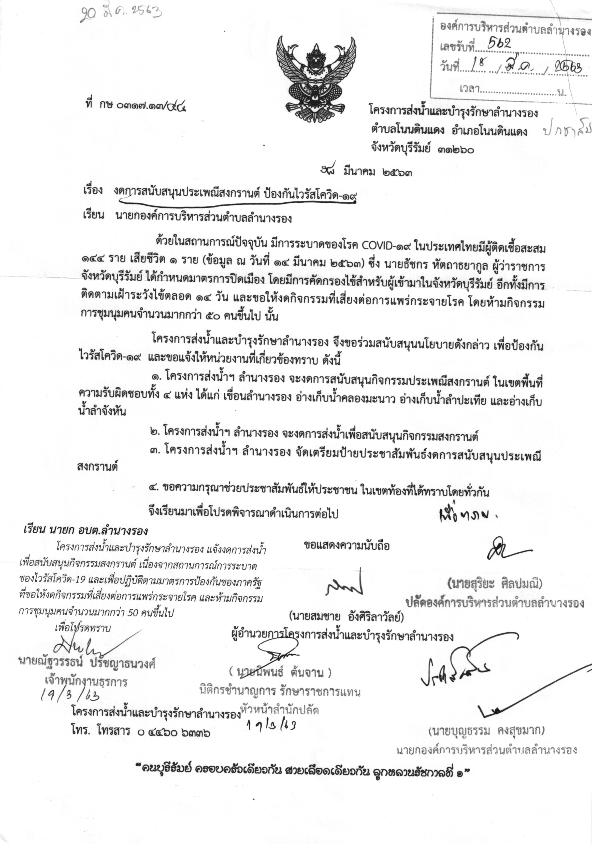 | 237 | อบต.ลำนางรอง งด! จัดงานประเพณีสงกรานต์และวันผู้สูงอายุ ประจำปี 2563 ลดความเสี่ยงต่อการติดเชื้อไวรัสโคโรนา |  | 19 มี.ค. 2563 | 168 |