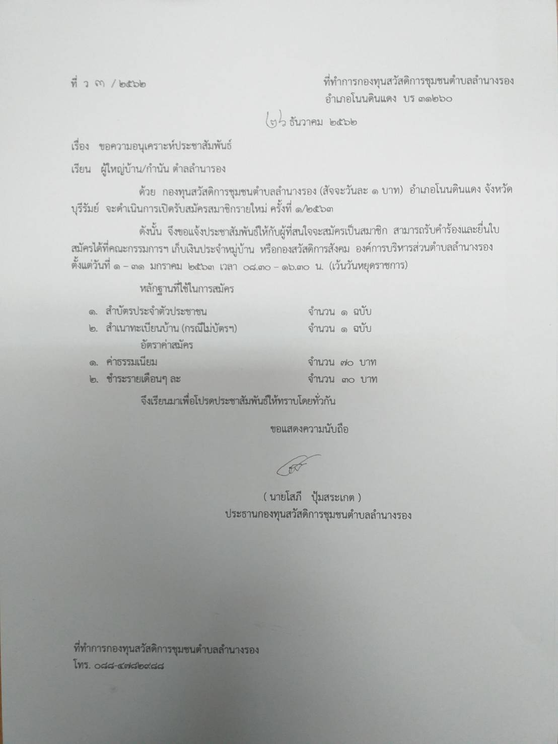 | 257 | กองทุนสวัสดิการชุมชนตำบลลำนางรอง(สัจจะวันละ 1 บาท) เปิดรับสมัครสมาชิกรายใหม่ ครั้งที่ 1/2563 |  | 26 ธ.ค. 2562 | 87 |