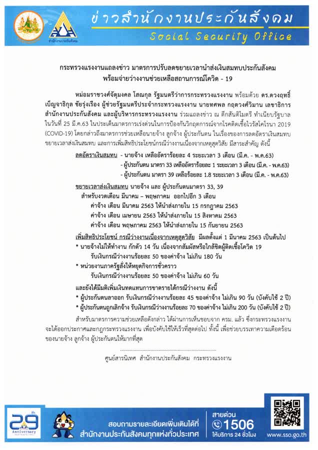 | 233 | ข่าวฝากประชาสัมพันธ์ จากกองสวัสดิการสังคม อบต.ลำนางรอง เรื่อง กระทรวงแรงงานแถลงข่าว มาตรการปรับลดขยายเวลานำส่งเงินสมทบประกันสังคม พร้อมจ่ายว่างงานช่วยเหลือสถานการณ์โควิด - 19 |  | 30 มี.ค. 2563 | 140 |