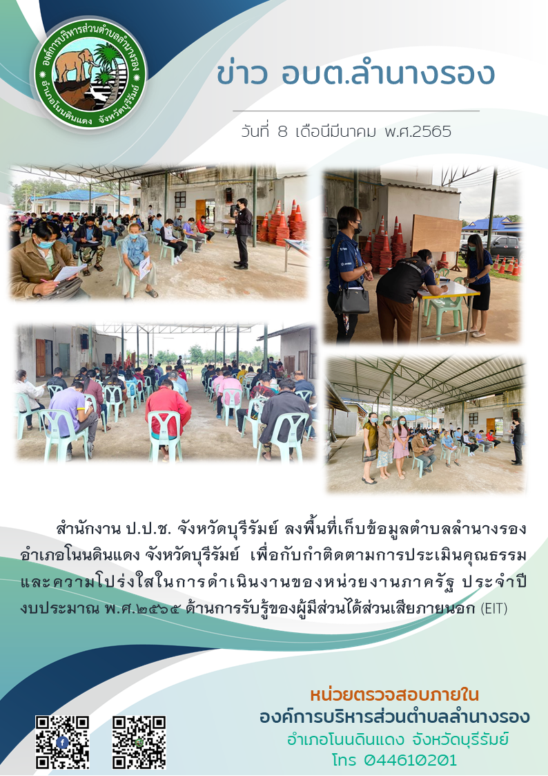 | 96 | สำนักงาน ป.ป.ช. จังหวัดบุรีรัมย์ ลงพื้นที่เก็บข้อมูลผู้มีส่วนได้ส่วนเสียภายนอก (EIT) |  | 8 มี.ค. 2565 | 132 |
