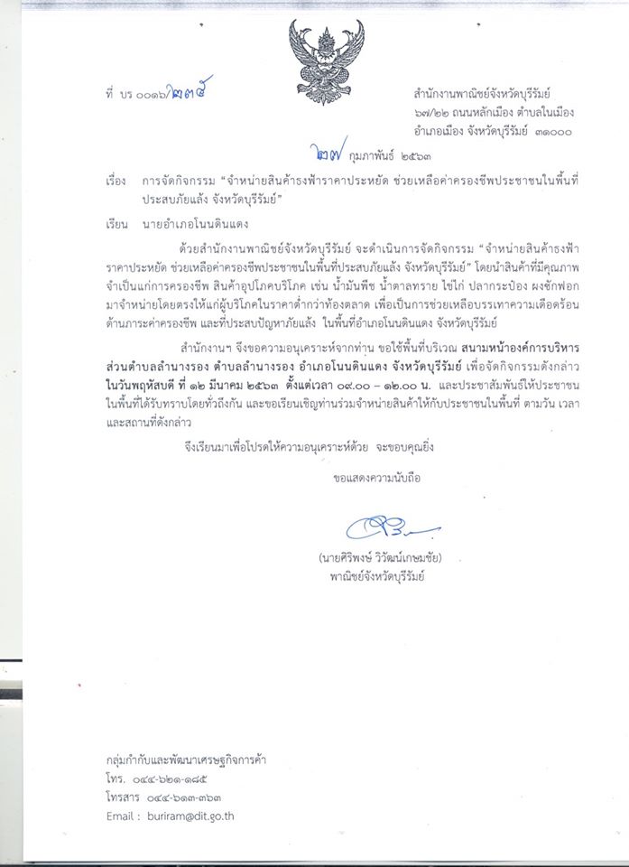 | 240 | ประชาสัมพันธ์ การจำหน่ายสินค้าธงฟ้าราคาประหยัด ช่วยเหลือค่าครองชีพประชาชนในพื้นที่ประสบภัยแล้ง จังหวัดบุรีรัมย์ ณ บริเวณสนามหน้า องค์การบริหารส่วนตำบลลำนางรอง วันที่ 12 มี.ค.2563 |  | 28 ก.พ. 2563 | 114 |