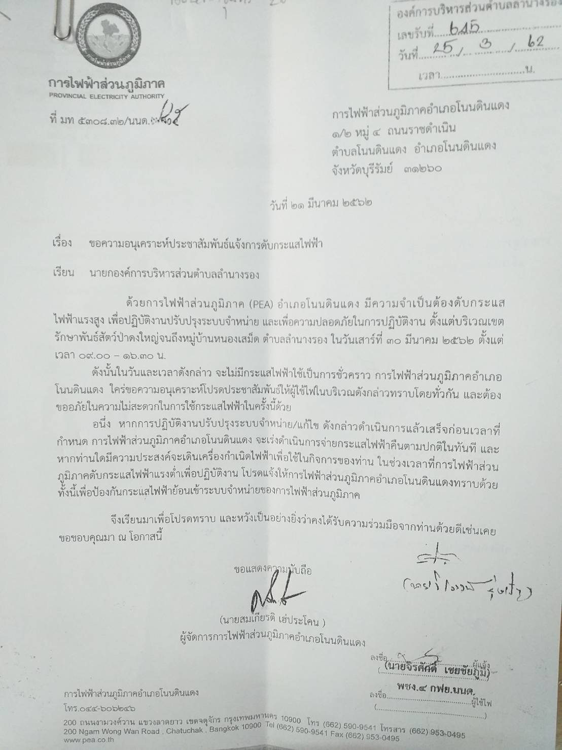 | 291 | การไฟฟ้าส่วนภูมิภาค(PEA)อำเภอโนนดินแดง แจ้งดับกระแสไฟฟ้าแรงสูงเพื่อความปลอดภัยในการปฏิบัติงานปรับปรุงระบบจำหน่าย วันที่ 30 มีนาคม 2562 |  | 26 มี.ค. 2562 | 155 |