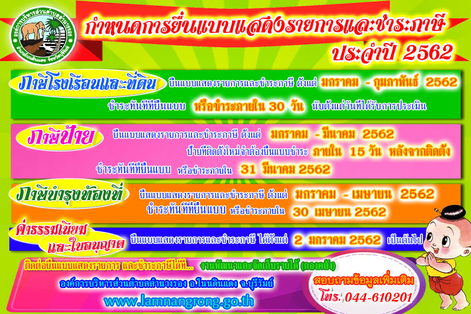 | 253 | ข่าวประชาสัมพันธ์จากกองคลัง อบต.ลำนางรอง เรื่อง การยื่นชำระภาษีป้ายประจำปี พ.ศ.2563 |  | 13 ม.ค. 2563 | 85 |