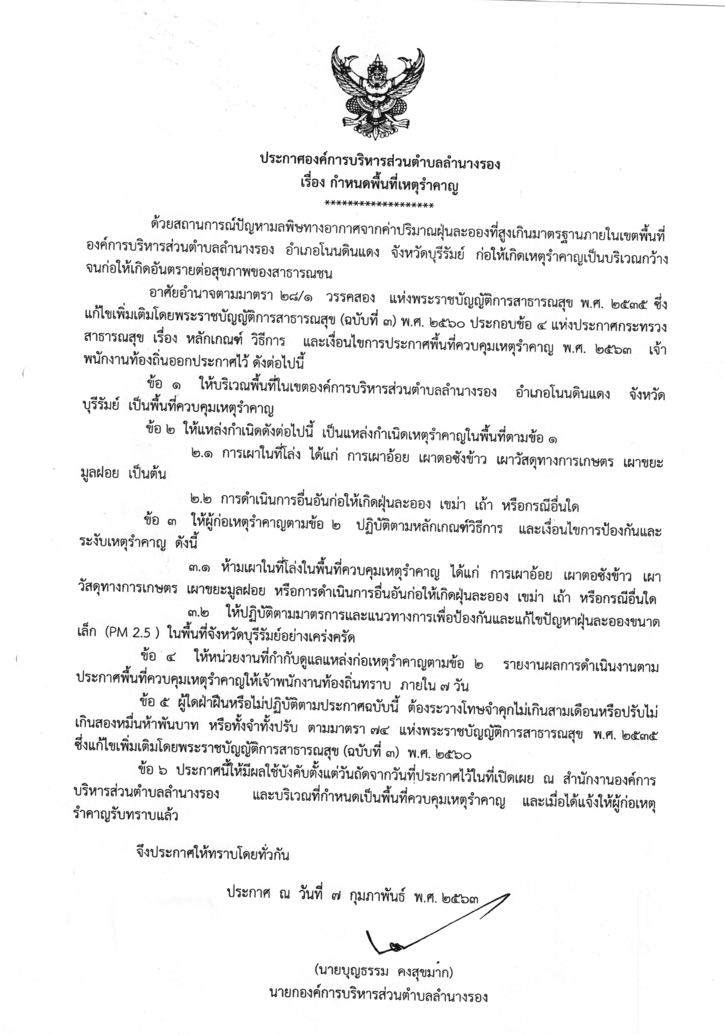 | 246 | ประกาศองค์การบริหารส่วนตำบลลำนางรอง เรื่อง กำหนดพื้นที่เหตุรำคาญ และ กำหนดมาตรการเพื่อป้องกันเหตุรำคาญจากการเผาในที่โล่ง พ.ศ.2563 |  | 13 ก.พ. 2563 | 99 |