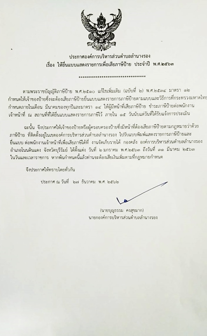 | 39 | ประกาศองค์การบริหารส่วนตำบลลำนางรอง เรื่อง การยื่นแบบเพื่อชำระภาษีป้ายฯ |  | 27 ธ.ค. 2566 | 76 |
