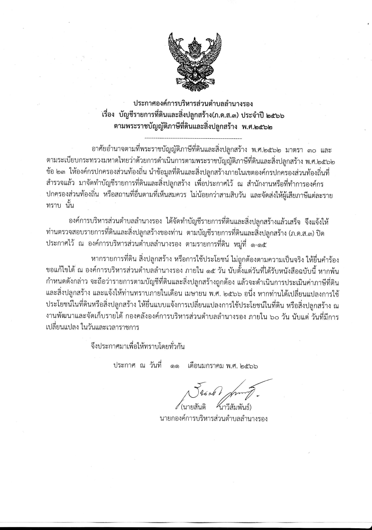 | 64 | ประกาศองค์การบริหารส่วนตำบลลำนางรอง เรื่อง การขยายกำหนดเวลาดำเนินการตาม พรบ.ภาษีที่ดินฯ |  | 8 พ.ค. 2566 | 41 |