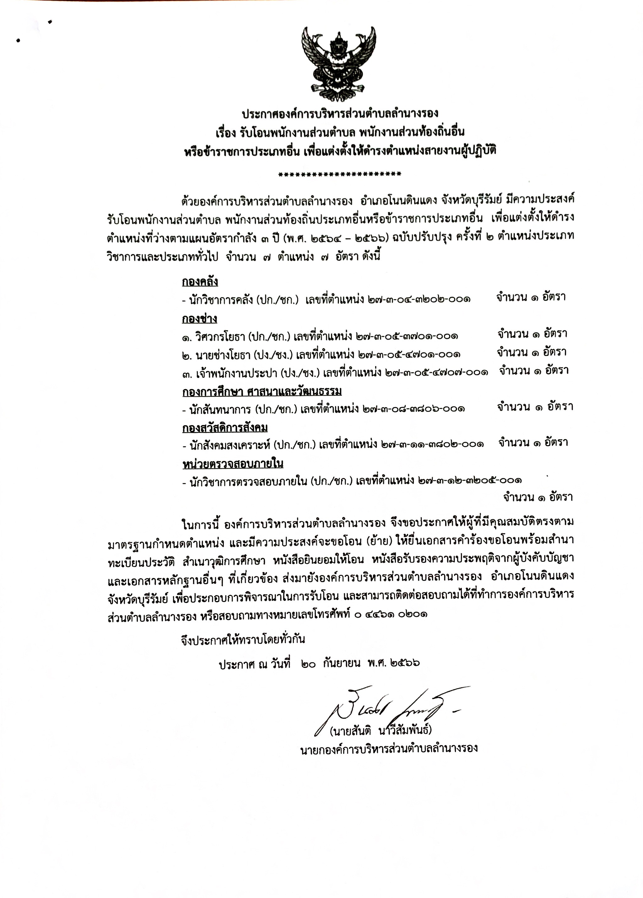 | 44 | ประกาศองค์การบริหารส่วนตำบลลำนางรอง เรื่อง รับโอนพนักงานส่วนตำบลฯ |  | 21 ก.ย. 2566 | 90 |
