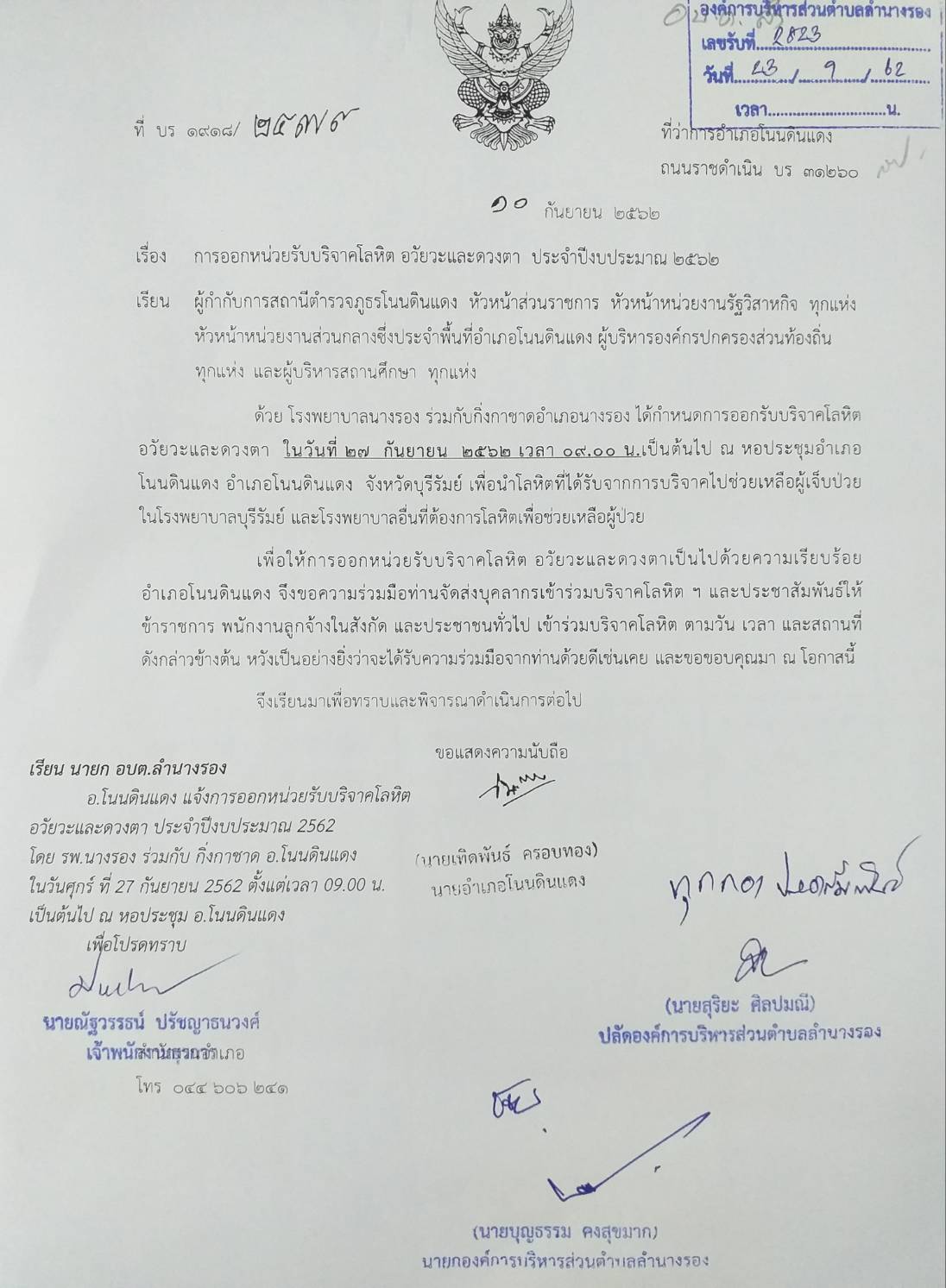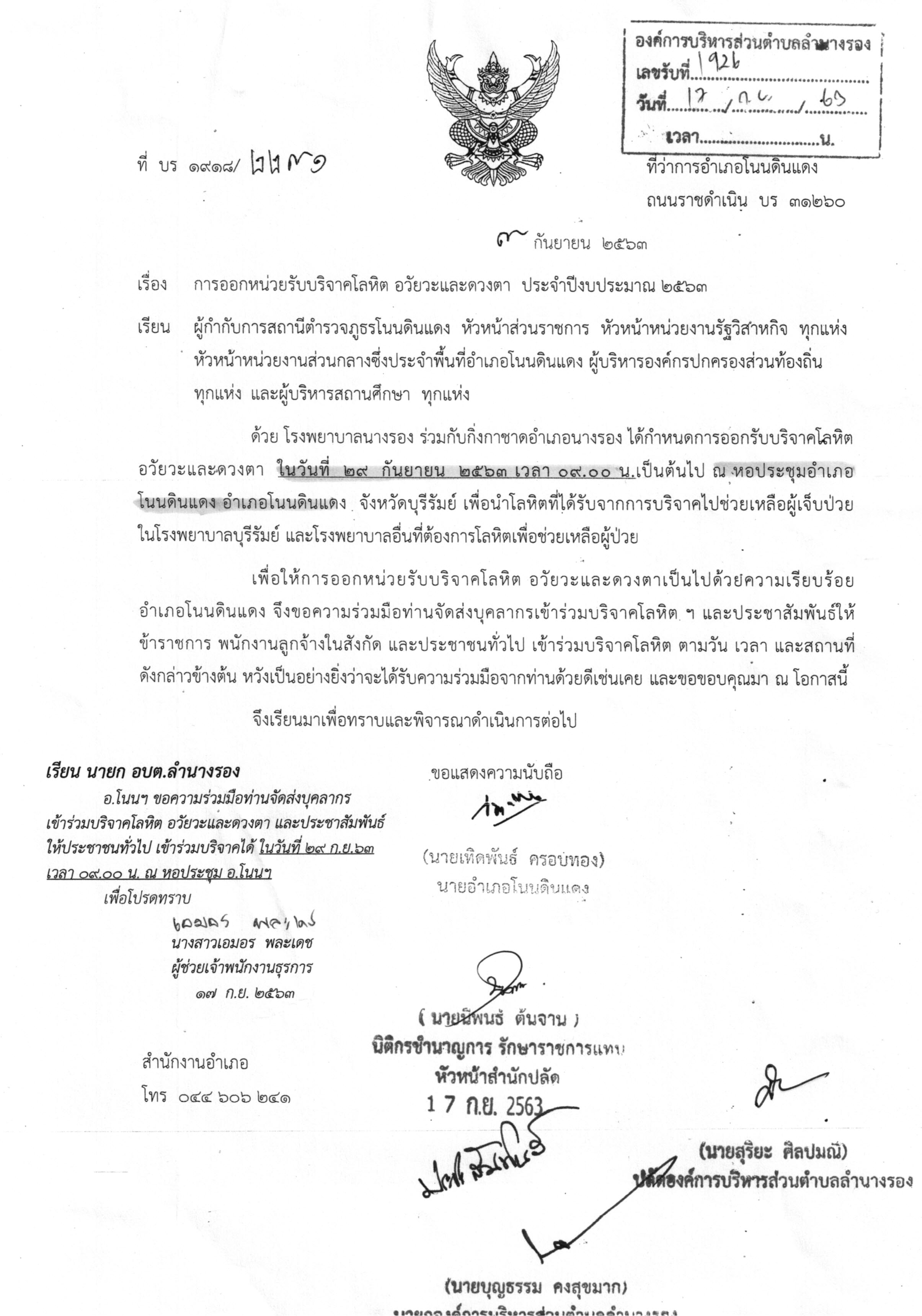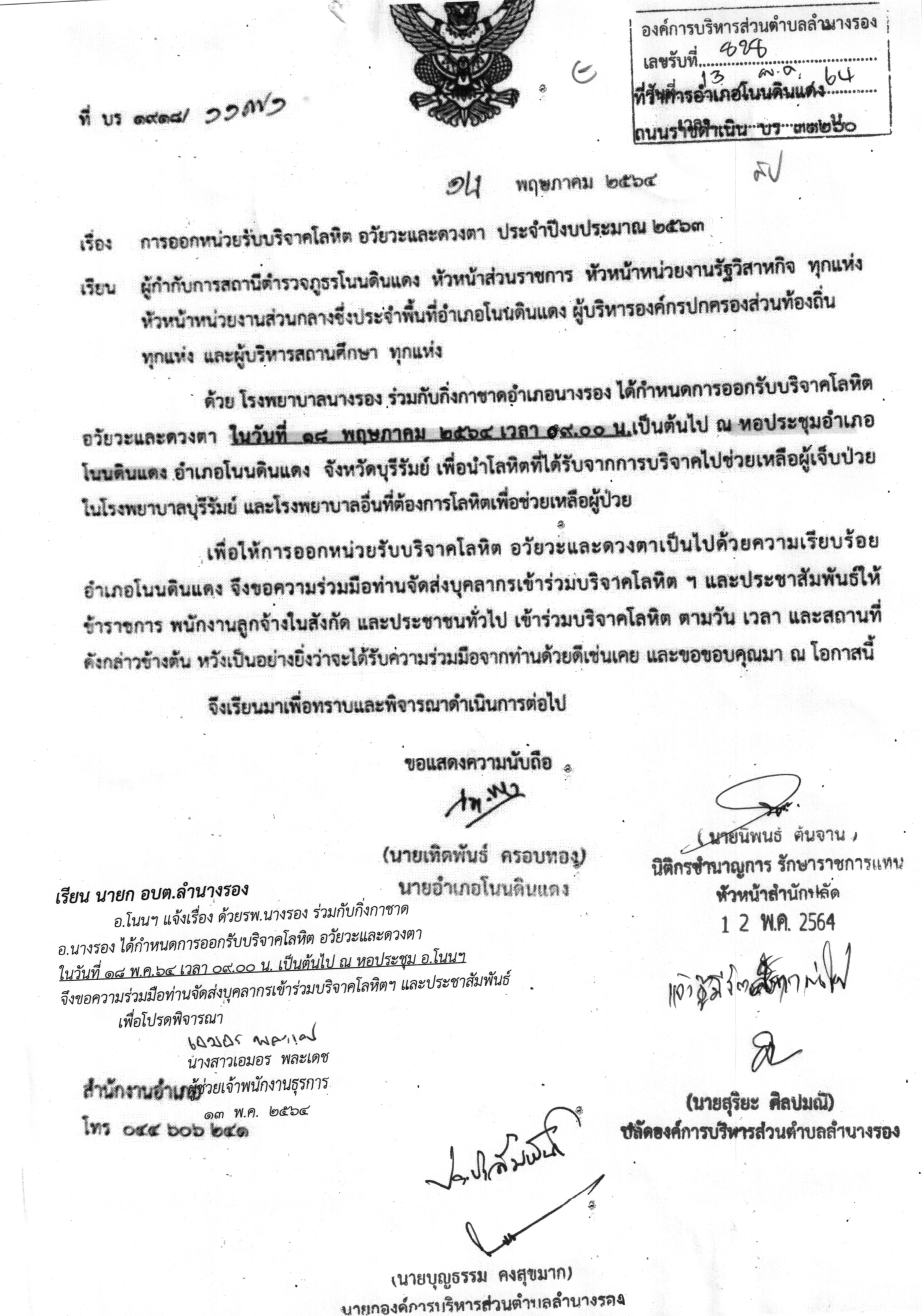 | 266 | ขอเชิญร่วมบริจาคโลหิต อวัยวะและดวงตา ในวันที่ 27 ก.ย.2562 เวลา 09.00 น. ณ หอประชุมอำเภอโนนดินแดง จ.บุรีรัมย์ |  | 25 ก.ย. 2562 | 78 |