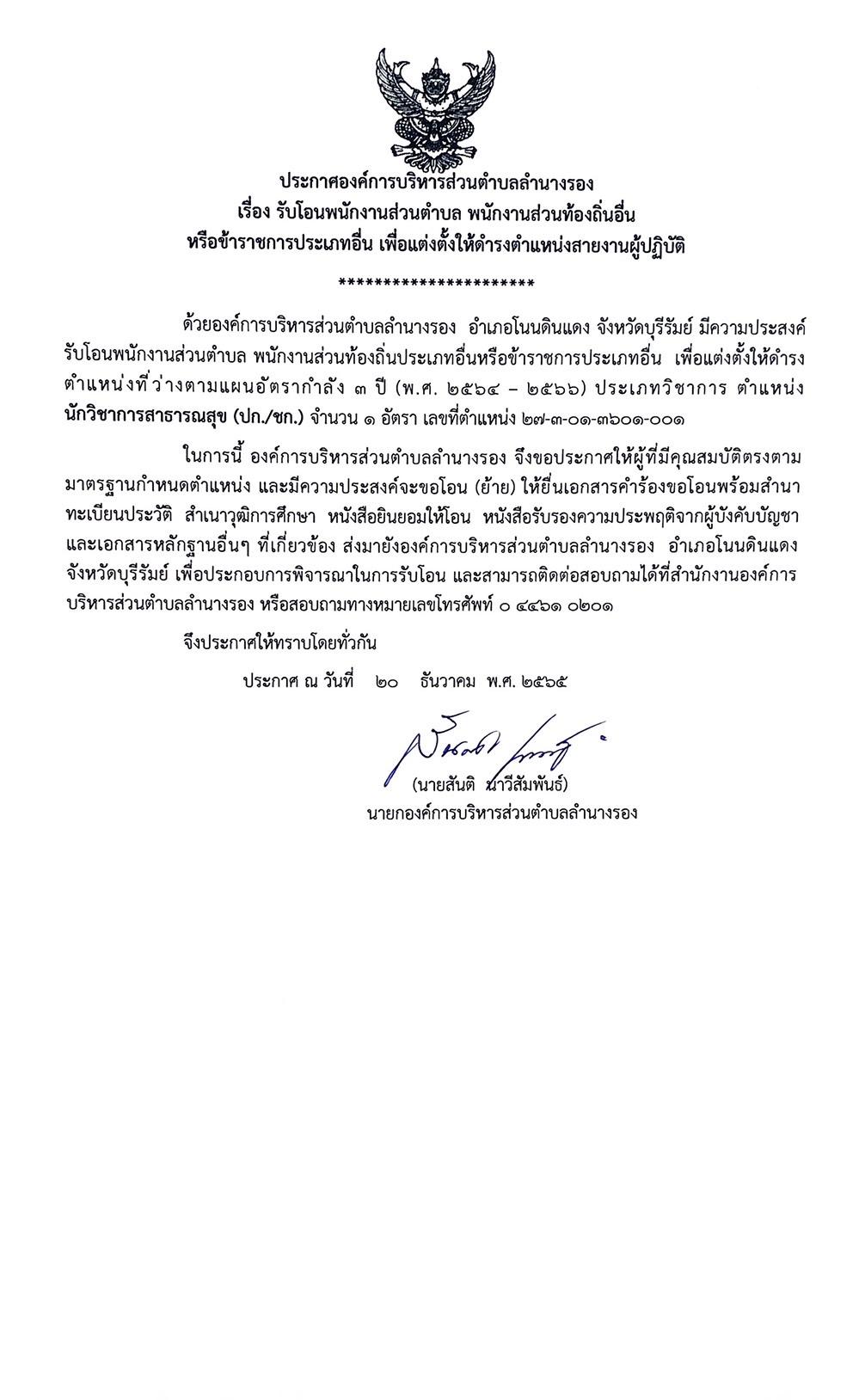 | 84 | ประกาศองค์การบริหารส่วนตำบลลำนางรอง เรื่อง รับโอนพนักงานส่วนตำบล พนักงานส่วนท้องถิ่นอื่น หรือข้าราชการประเภทอื่น เพื่อแต่งตั้งให้ดำรงตำแหน่งสายงานผู้ปฏิบัติ |  | 29 ธ.ค. 2565 | 129 |