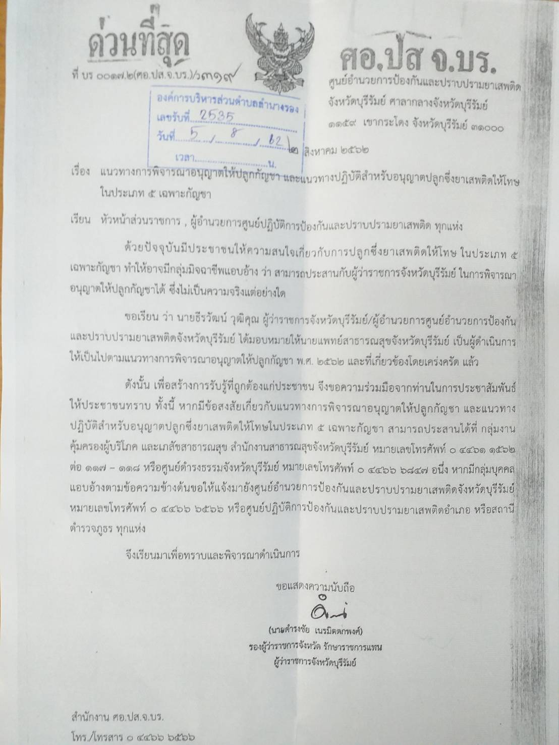 | 274 | ศูนย์ปฏิบัติการป้องกันและปราบปรามยาเสพติดจังหวัดบุรีรัมย์ แจ้งประชาสัมพันธ์แนวทางการพิจารณาอนุญาตให้ปลูกกัญชา และแนวทางปฏิบัติสำหรับอนุญาตปลูกซึ่งยาเสพติดให้โทษในประเภท 5 เฉพาะกัญชา เพื่อสร้างการรับรู้ที่ถูกต้องแก่ประชาชน |  | 7 ส.ค. 2562 | 287 |