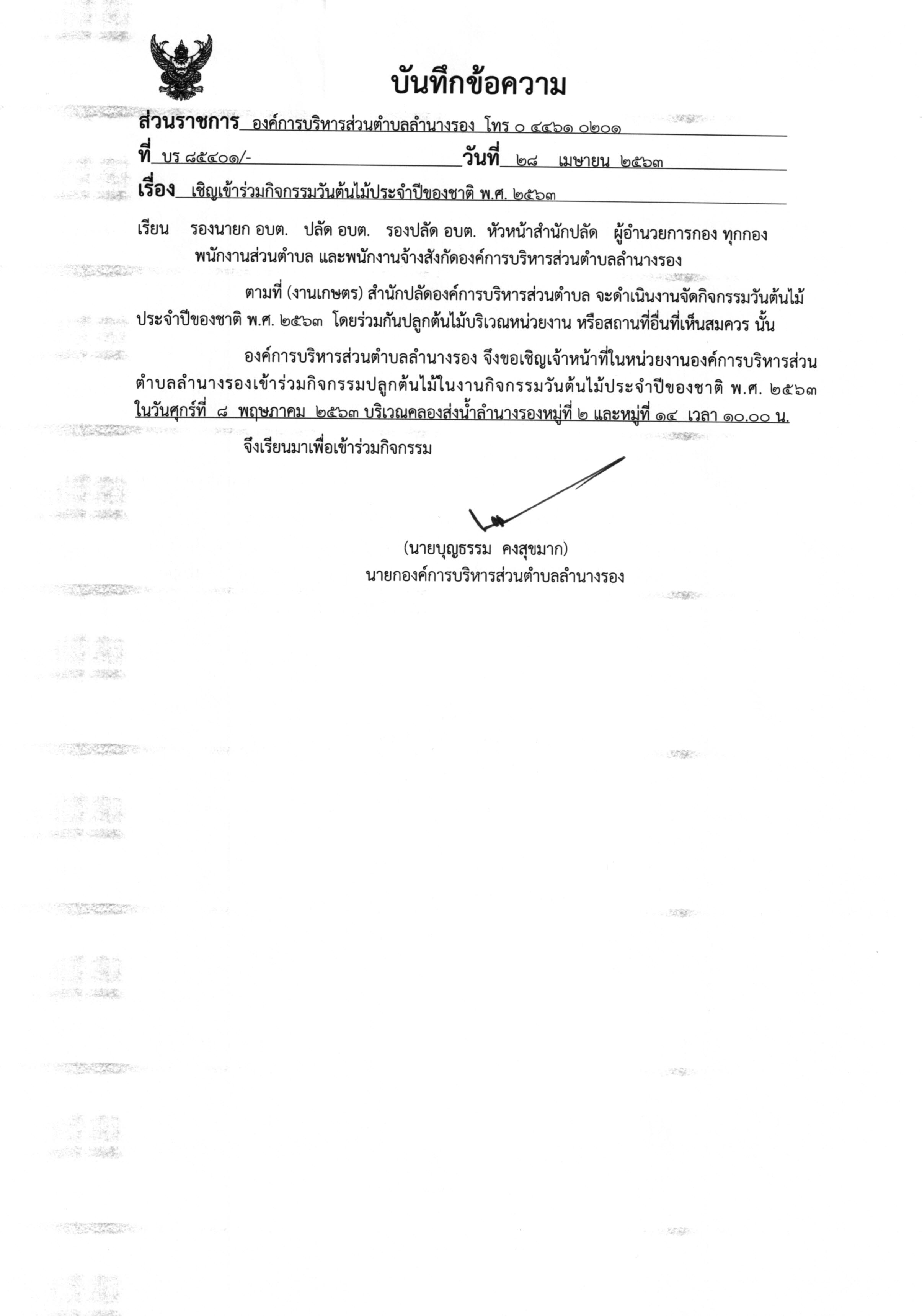 | 286 | อบต.ลำนางรอง ขอเชิญชวนประชาชนชาวตำบลลำนางรองและใกล้เคียง ร่วมกิจกรรมวันต้นไม้ประจำปีของชาติ พ.ศ.2562 |  | 15 พ.ค. 2562 | 74 |