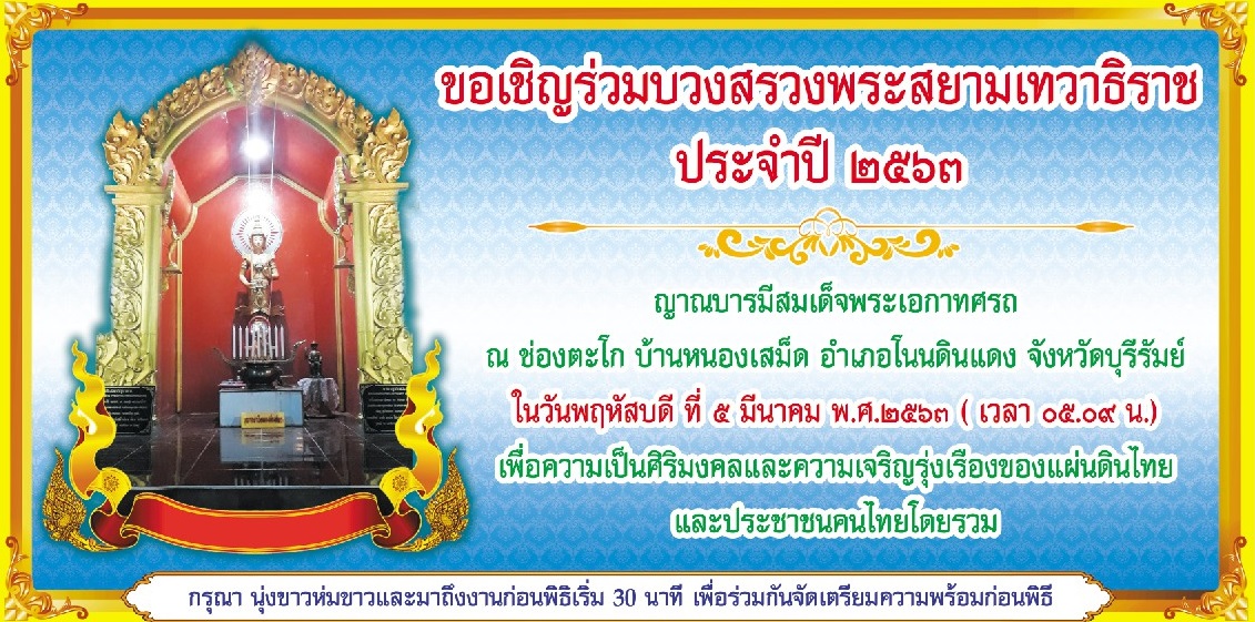 | 241 | ขอเชิญร่วมบวงสรวงพระสยามเทวาธิราช ประจำปี 2563 ณ ด่านช่องตะโก บ้านหนองเสม็ด อ.โนนดินแดง จ.บุรีรัมย์ วันที่ 5 มี.ค.2563 |  | 28 ก.พ. 2563 | 324 |