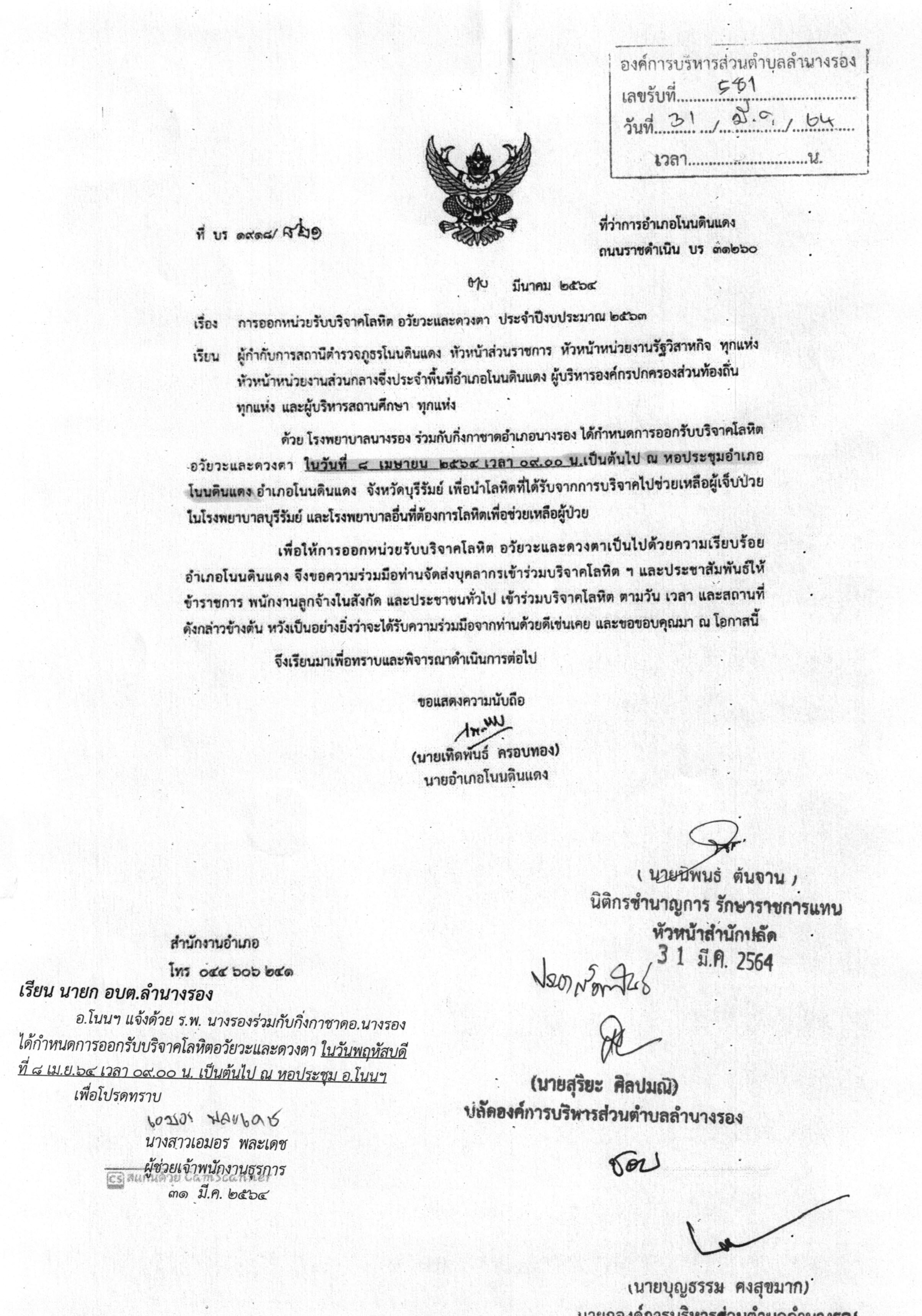 | 238 | ขอเชิญร่วมบริจาคโลหิต ในวันอังคารที่ 24 มีนาคม 2562 เวลา 09.00 น. เป็นต้นไป ณ หอประชุมอำเภอโนนดินแดง อ.โนนดินแดง จ.บุรีรัมย์ |  | 18 มี.ค. 2563 | 105 |
