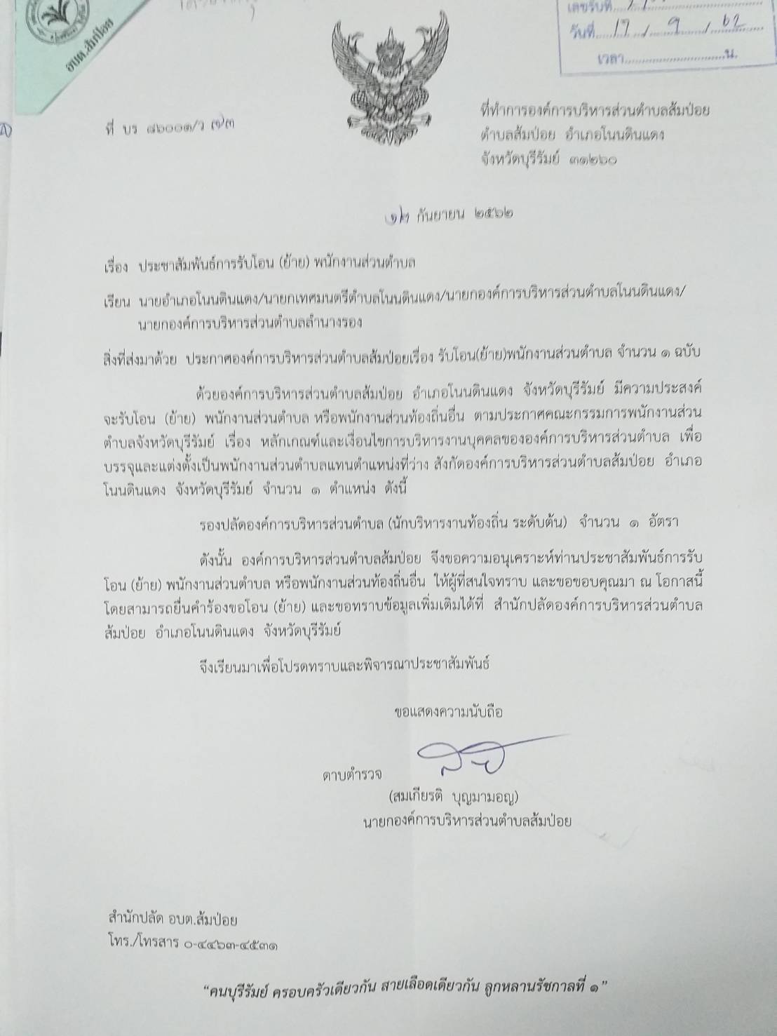 | 269 | ข่าวประชาสัมพันธ์จาก อบต.ส้มป่อย การรับโอน(ย้าย) พนักงานส่วนตำบล รองปลัดองค์การบริหารส่วนตำบล (นักบริหารงานท้องถิ่น ระดับต้น) จำนวน 1 อัตรา |  | 17 ก.ย. 2562 | 325 |
